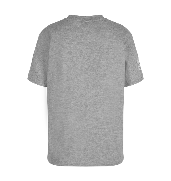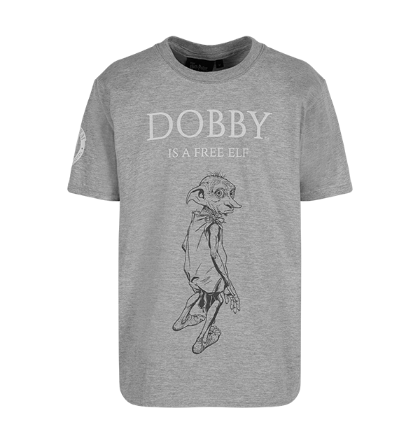 A grey kids t-shirt featuring Dobby and the Platform 9 3/4 logo on the arm.
