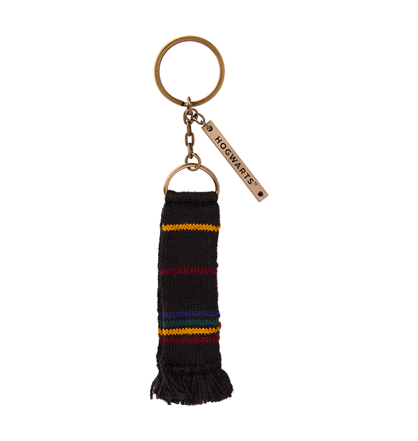 If it’s a bit too warm out for knitwear, not to worry! Show loyalties to Hogwarts with this miniature replica Hogwarts scarf keyring. This keyring features a soft, acrylic knit scarf in Hogwarts colours and a brushed brass look to the metal chain. It also includes a long rectangular charm with embossed “Hogwarts” text and a black gem embedded at the bottom.