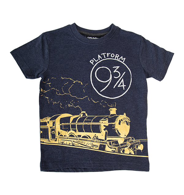 This amazing dark grey kids Hogwarts Express t-shirt will have budding students excited for their first trip to Hogwarts! Featuring a large graphic of the Hogwarts Express leaving Platform 9 ¾ at Kings Cross station, the famous steam engine can be seen in a yellow gold print. A Platform 9 ¾ circular logo takes up a large part of the top left hand side of the chest in a whimsical white font.
