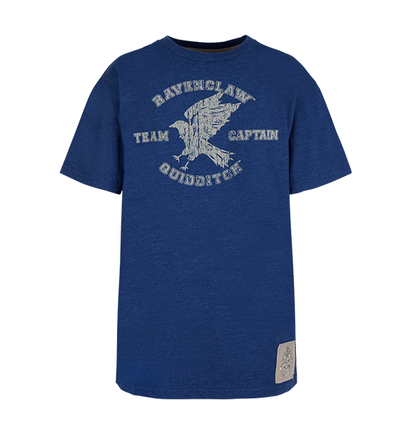 Join the Ravenclaw Quidditch team with this Kids Ravenclaw Quidditch Team Captain t-shirt. The t-shirt is a blue colour, the traditional colour of the Ravenclaw house, and features a raised flock print design across the chest in grey of the Ravenclaw house animal, an eagle.