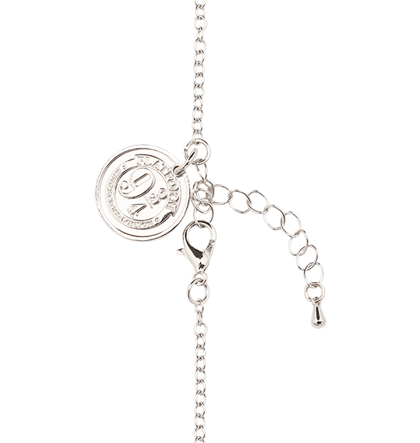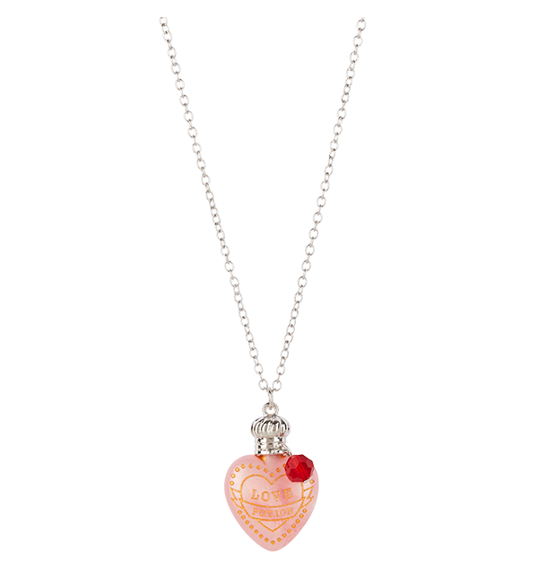 A striking iridescent pink heart with gold writing is set in contrast to a silvered clasp and chain, while a ruby red gem detail hangs from the potion’s cap. The front reads ‘Love Potion’ inside a painterly looking golden heart and banner. The adjustable chain features a Platform 9 ¾ logo charm at the end, alongside its partnering lobster claw style clasp.