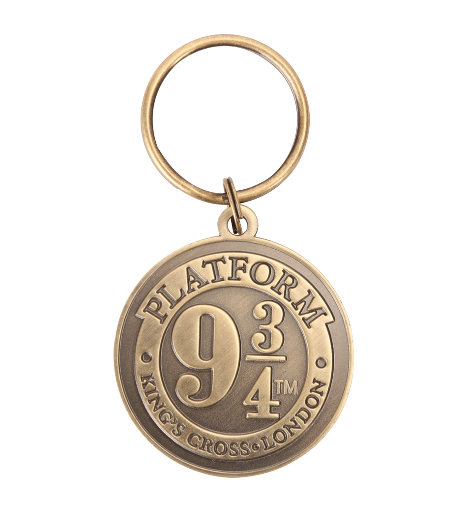 A brass effect stamped Platform 9 3/4 logo key ring and replica of the Hogwarts Express train ticket that takes Harry from London to Hogwarts.
