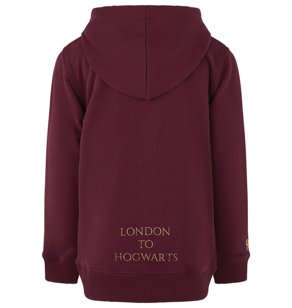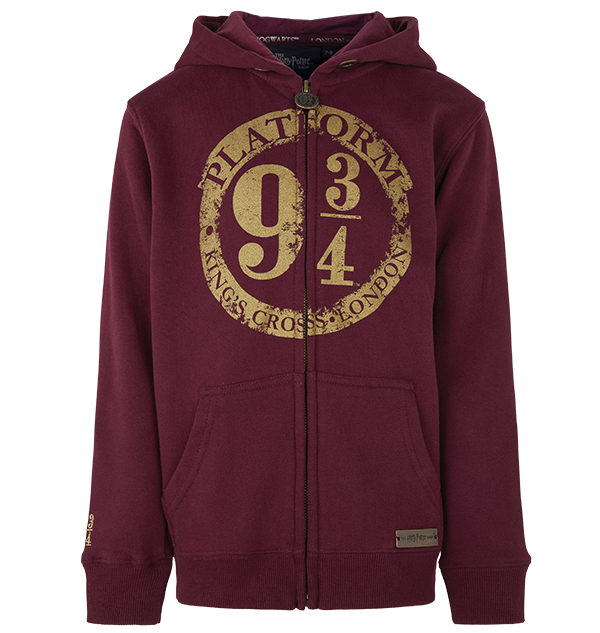 Add some magic to your wardrobe with this kids unisex Platform 9 ¾ hoodie. The scarlet red zip up hoodie features the symbol of Platform 9 ¾, the iconic King’s Cross platform where Harry Potter boarded the Hogwarts Express. The Platform 9 ¾ logo is also featured in a small design on the hoodie’s sleeve. The hoodie includes two front pockets and has a silver zip which can be adjusted for a suitable and comfortable fit.