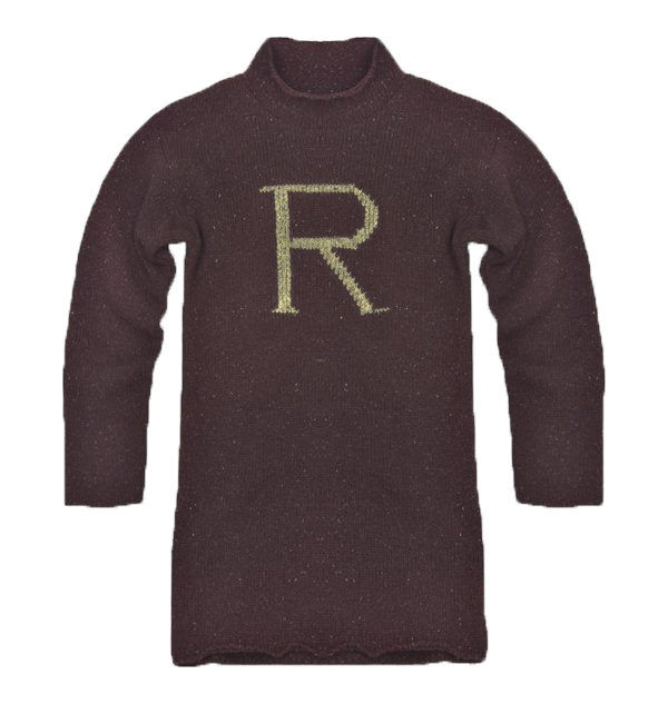This youth ‘R’ jumper is a replica of the jumper knitted by Mrs. Weasley for Ron in the Harry Potter film series. Using a specially made wool-silk yarn, this jumper is knitted and assembled in the Scottish Mill that made the costumes for the cast and extras in the Harry Potter film series. Available in youth sizes.