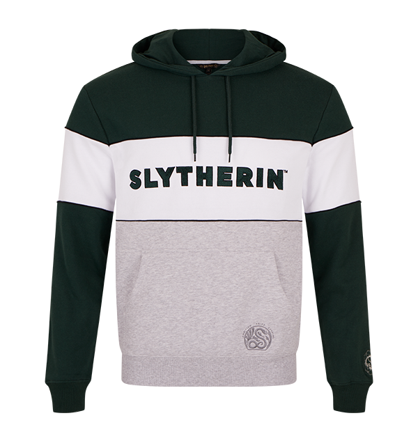 Get ready for the Sorting Hat ceremony with this bespoke Slytherin Hoodie. The hoodie features a colour block design in white, light grey and emerald green, the traditional colour of Slytherin. The hoodie is complete with the text ‘Slytherin’ appliqued across the chest.