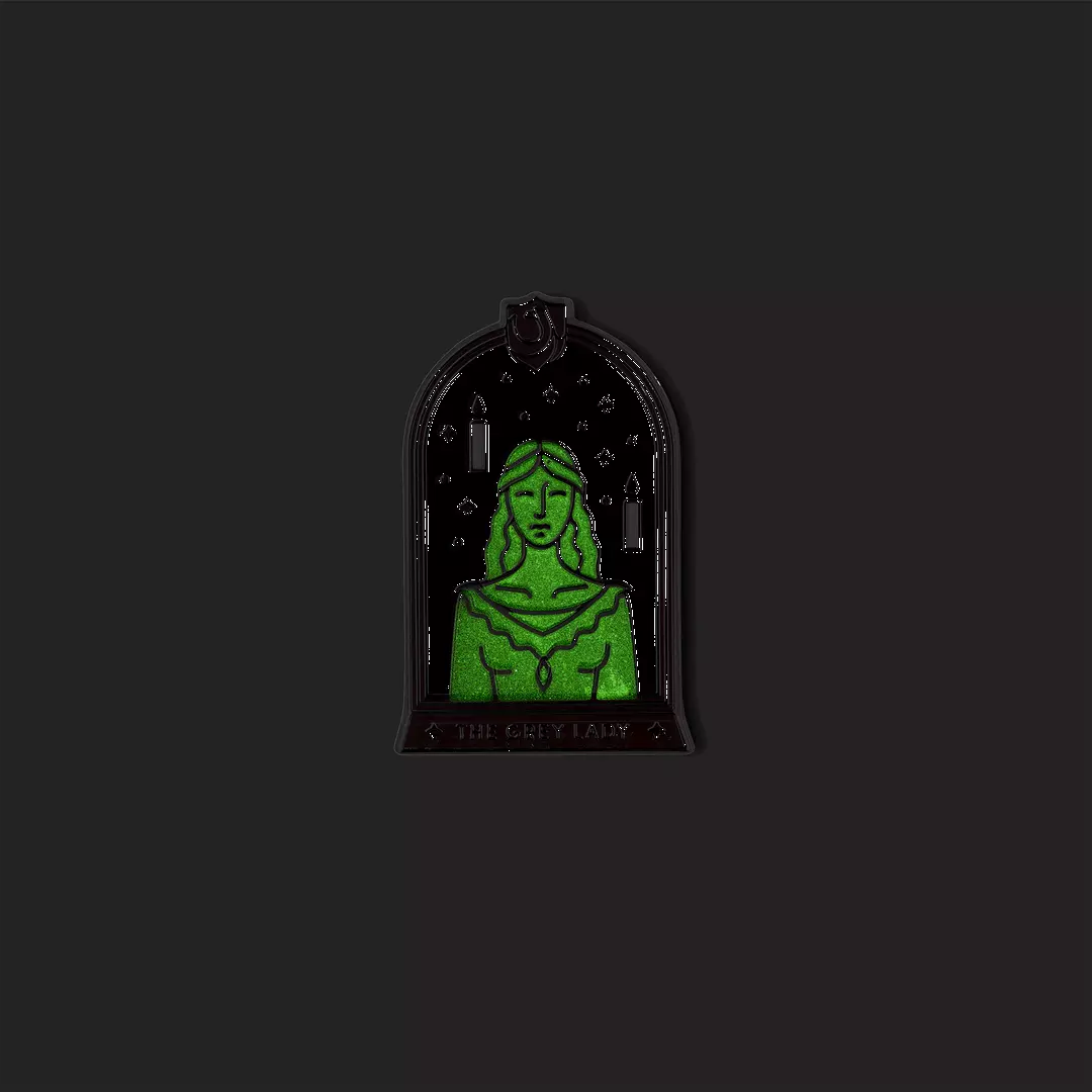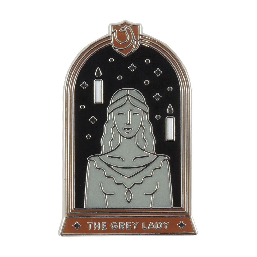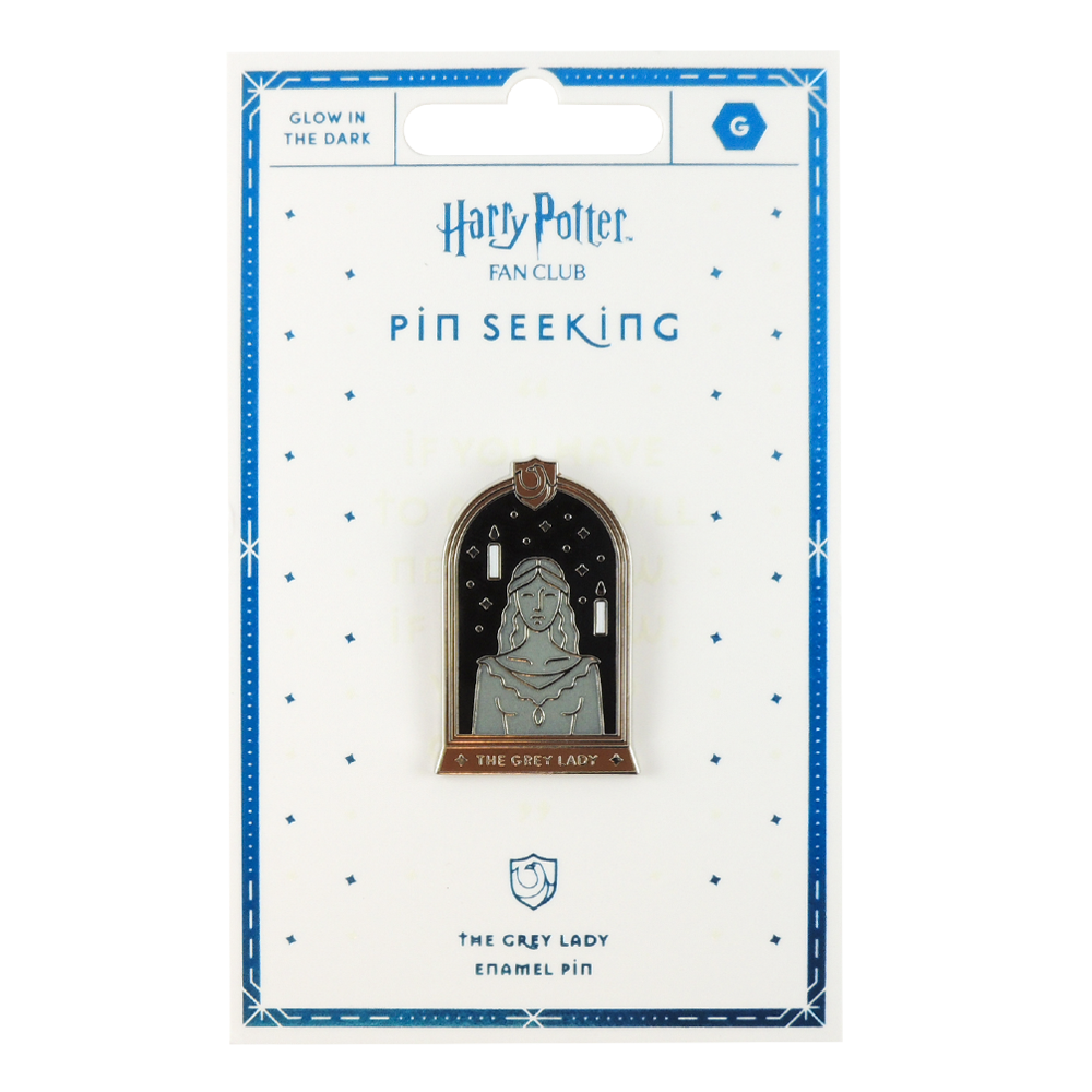 Get help from Ravenclaw’s house ghost with this Grey Lady pin! This glow in the dark pin features the Grey Lady’s portrait beneath the Ravenclaw house crest and a sky full of floating candles and stars. Finely detailed, making it the perfect gift for clever Ravenclaws!