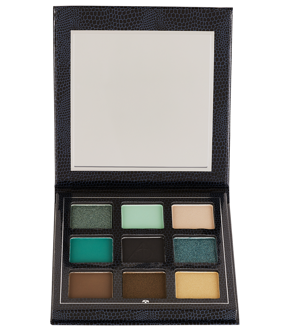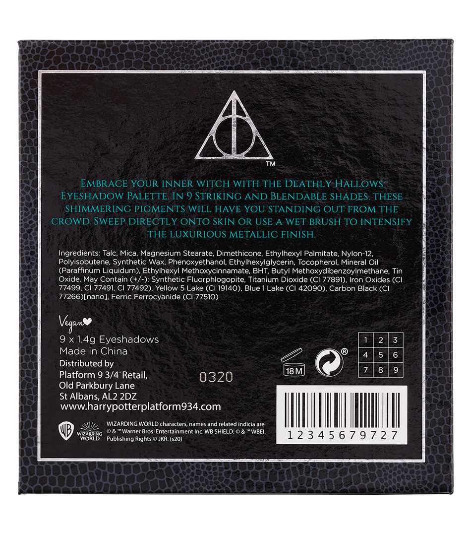 Embrace your inner witch with the Deathly Hallows Eyeshadow Palette. Available in nine striking and blendable shades, these high-colour pigments will have you standing out from the crowd with their bold colour finish. Sweep directly onto eyelids or use a wet brush to intensify the luxurious metallic colours. Create infinite eye looks taking you from daytime to nighttime with the metallic and matte textured shadows. The eyeshadow palette is complete with a glossy black and grey snakeskin packaging and includes a mirror on the inside of the palette. Deathly Hallows Eyeshadow Palette is vegan and cruelty-free. Keep away from heat.