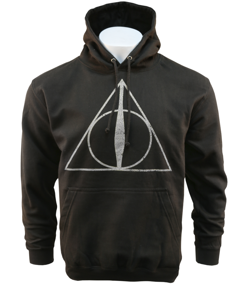 With the Elder Wand, Resurrection Stone, and the Cloak of Invisibility combined, you get this stylish jumper.ย This hoodie features a statement Deathly Hallows symbol in silver, with the Platform 9 3/4 logo adorning the right arm. It also includes a full tunnel pocket in front to hide away your magic trinkets, or just to keep hands warm in the cooler months.