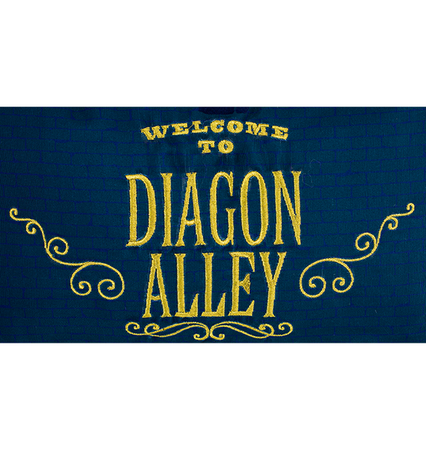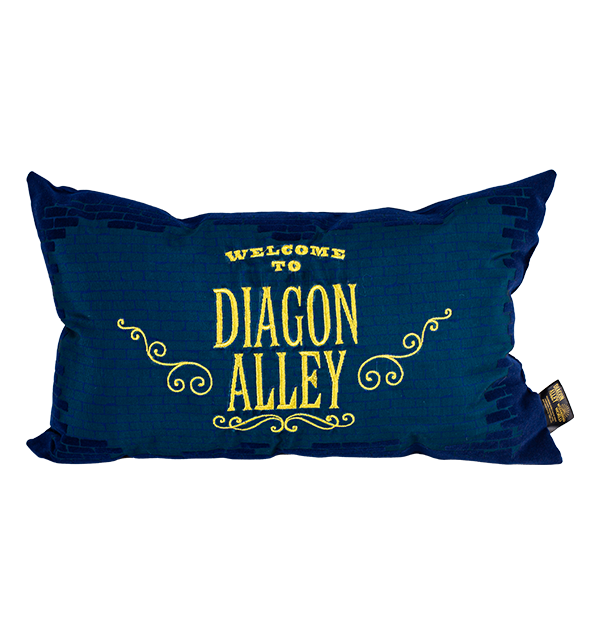 “Welcome to Diagon Alley” exclaims a decorative golden font on this brilliant cerulean blue pillow, complete with curled vintage looking flourishes. With a complimentary raised flock brick detail to line the back and edges, specially created for the Harry Potter Shop’s Diagon Alley collection.