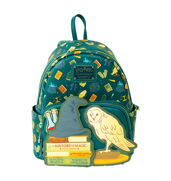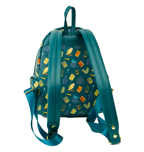 Get ready for your next year at Hogwarts with this stylish teal coloured miniature backpack from Loungefly. Everything you could expect to see on your shopping journey to Diagon Alley can be found here! Potions, robes and other magical supplies adorn the all-over print of the main body of the bag, while stunning die cut artwork of textbooks, an owl and the Sorting Hat feature prominently on the front pocket. From the exquisite stitching to the Hogwarts crest charm zipper tab, no detail of this backpack has been left untouched!