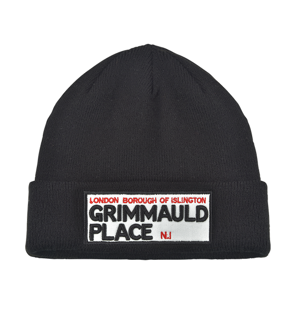 This black beanie features a Grimmauld Place street sign patch on the front, with stitched lettering detail.
