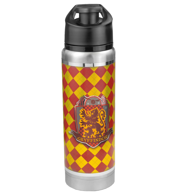 The flask is decorated with a red and gold chequered wrap and features the iconic Gryffindor Crest on the front. On the reverse of the flask, the word ‘Gryffindor’ is printed in white.