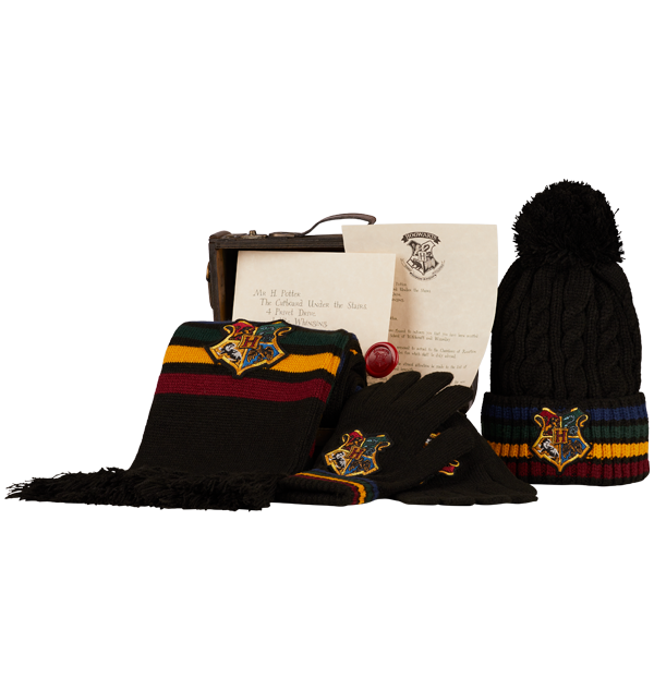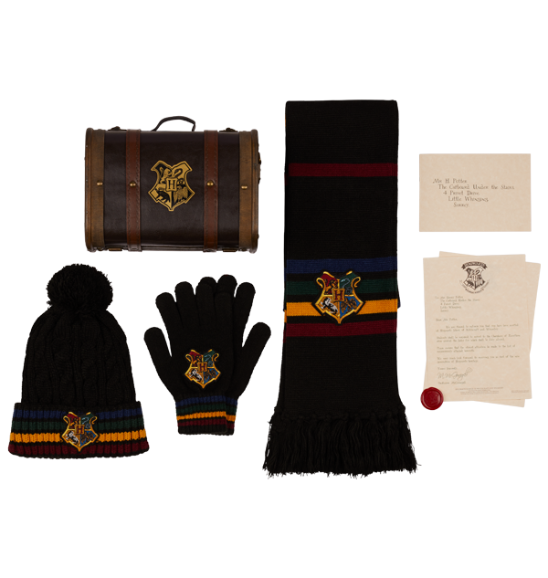Take home this mini version of the Hogwarts School Trunk, crafted to resemble those used by Hogwarts students travelling on the Hogwarts Express. This bespoke Hogwarts gift trunk features some exclusive items from our knitwear collection, as well as a Hogwarts Acceptance Letter, personalised with your own name and complete with an exclusive supplies list.