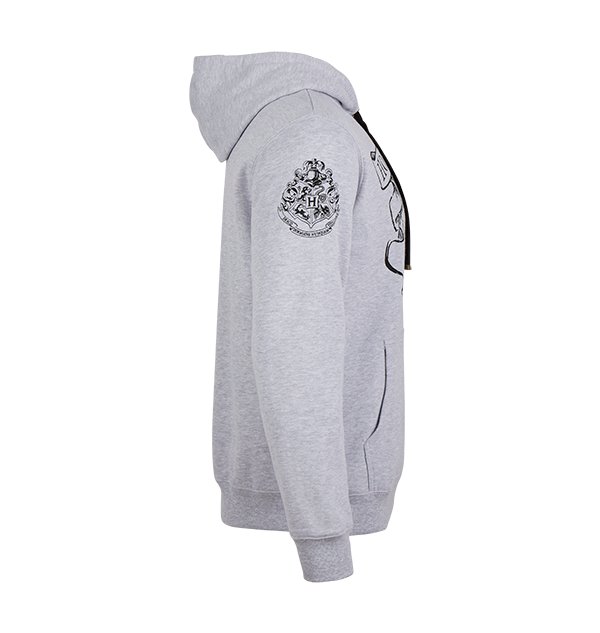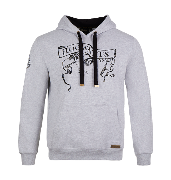 Wizardry school pride is made easy with this statement Hogwarts scroll jumper. This hoodie features the celebrated and iconic Hogwarts crest in a black design alongside a scroll complete with ‘Hogwarts’ written on it. The light grey hoodie includes a full tunnel pocket in front to hide away your trinkets, or just to keep hands warm in the cooler months. The hoodie has a fitted hood with a black interior and two black strings which are adjustable for a suitable and comfortable fit.