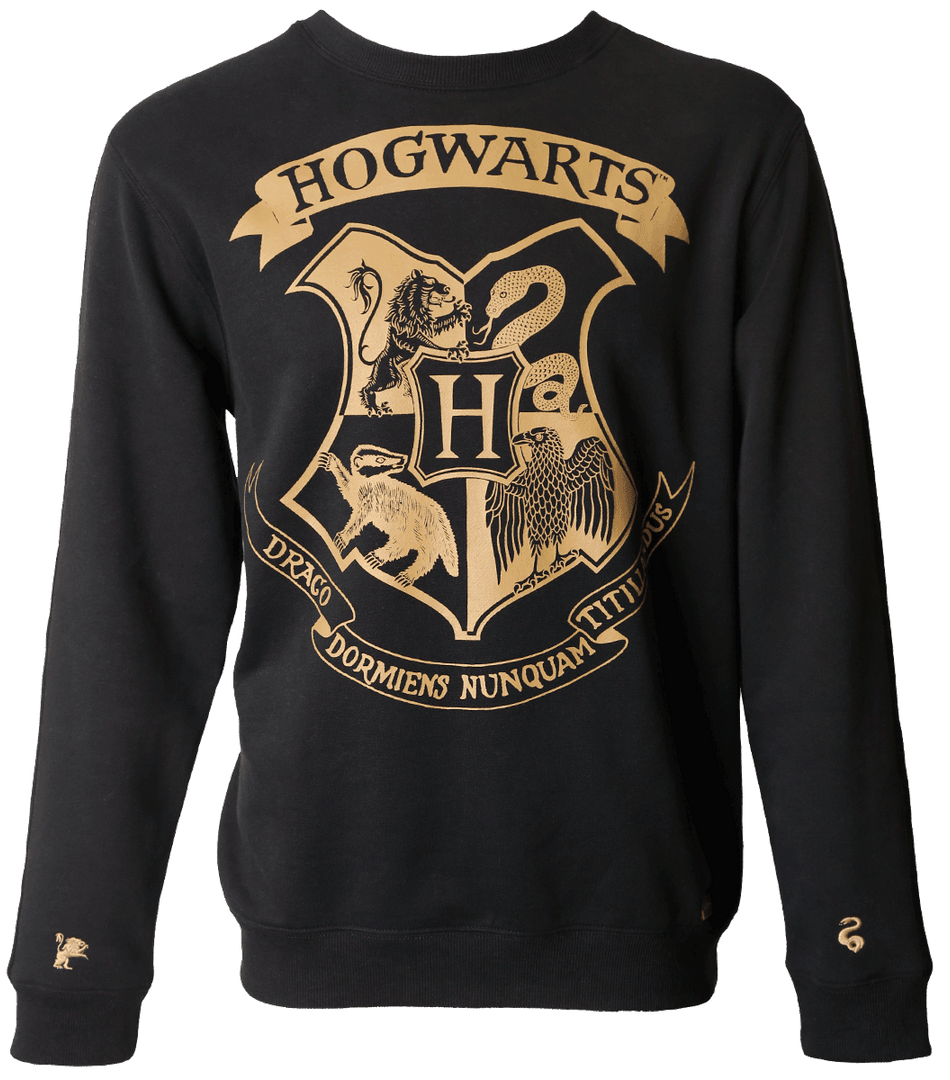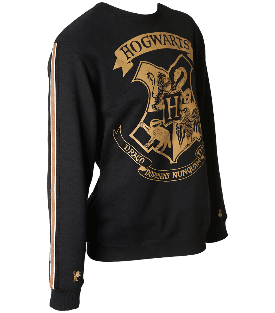Take home this brand new and exclusive Hogwarts sweatshirt which is stylish and cosy. This sweatshirt is made from soft cotton material and has a black background which is complete with the statement and iconic Hogwarts crest printed in a gold metallic design. Both sleeves of the sweatshirt include a gold stripe along the sleeve and feature small symbols of a lion & badger on one arm and a serpent and eagle on the otherΒ arm; the fourΒ historical symbols of the rivalled and celebrated houses Gryffindor, Hufflepuff, Slytherin and Ravenclaw.
