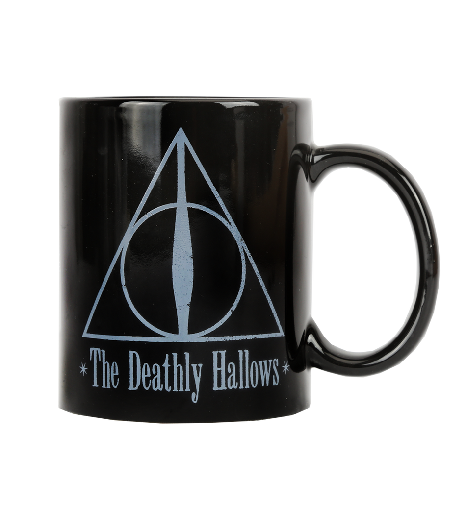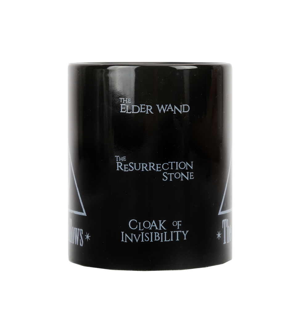 A black mug featuring the Deathly Hallows symbol in a grey print on one side, and the words ‘The Elder Wand’, The Resurrection Stone’ and the ‘Cloak of Invisibility’, the objects that together make the Deathly Hallows on the other.