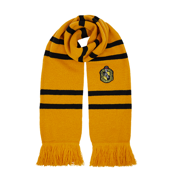 Keep warm and complete your Hufflepuff look with this unique knitted scarf. The scarf comes in mustard yellow and black, the traditional colours of the Hufflepuff house. The Hufflepuff house crest is embroidered on the left end of the scarf which features an badger, the iconic animal of the house.