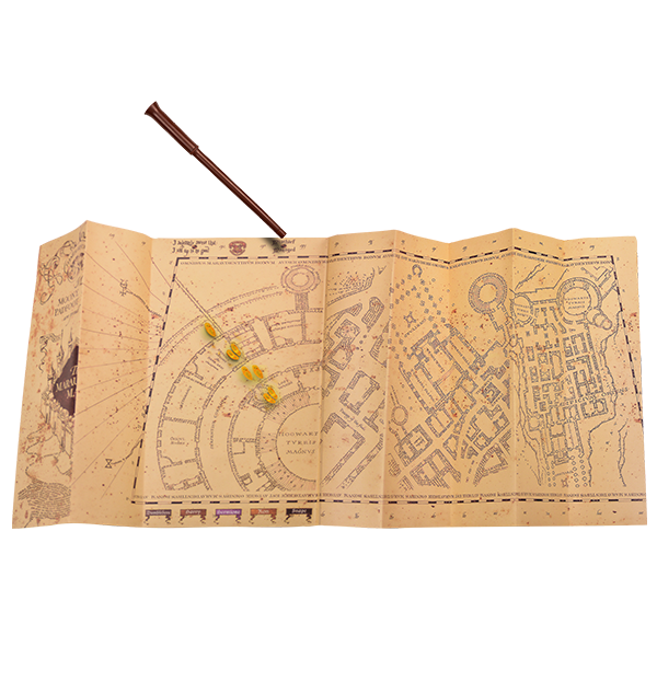 The PVC wand activates 5 footprint patterns and 9 sounds and is made from printed paper/artboard with a gloss finish. The folded map measures at approximately 40cm H x 20.5cm W and once opened, measures at approximately 40cm H x 101cm W. Wand measures at 25cm L. Mischief managed!