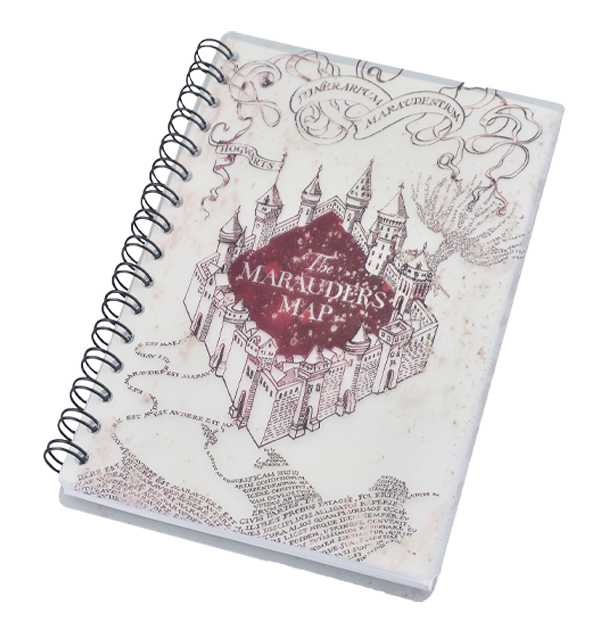 This spiral bound lined notebook has a durable PVC cover featuring a section of the Marauder’s Map.
