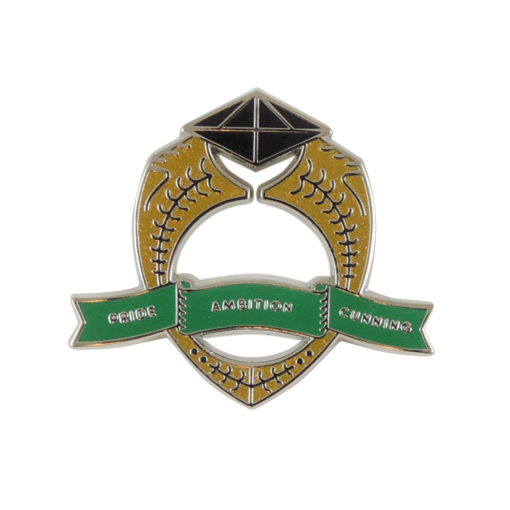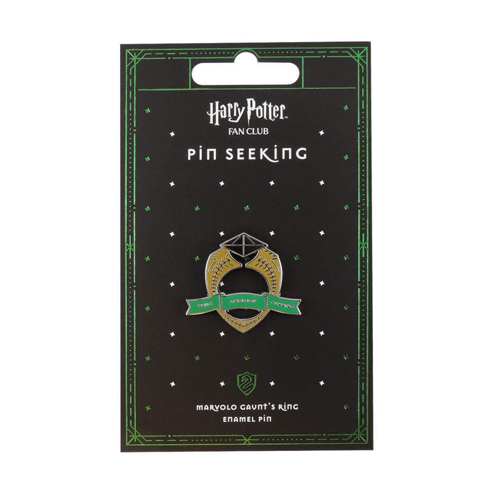 Marvolo Gaunt’s ring is no ordinary family heirloom, as it holds one of the Deathly Hallows: the Resurrection Stone. This pin features the enchanted ring behind a green banner, decorated with the wording “Pride, Ambition, Cunning”.