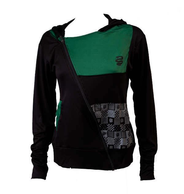 Light weight and breathable, the fabric is comfortable and flexible enough to conform to your every move. Featuring a sleek modern asymmetrical collar with zip front and overall geometric design, every Slytherinย sporting one of these fashionable jackets will be turning heads.ย A snake can be seen on the left chest and in a grey heraldic pattern featured prominently at the bottom. Two front pockets are lined in contrasting colours, while the Slytherinย house and Hogwarts school name are printed at the back.