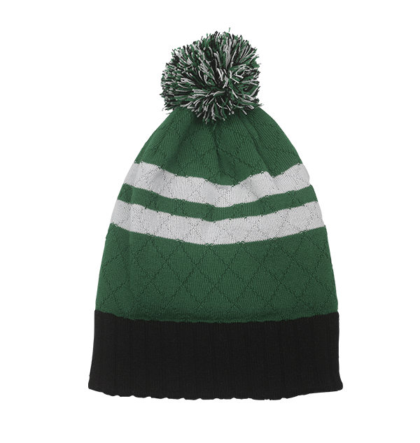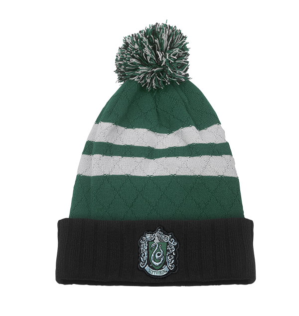 The iconic Slytherin crest is embroidered into the centre of the hat and overlaid on a black background. The bobble on the top of the hat is coloured with green and white tassels.