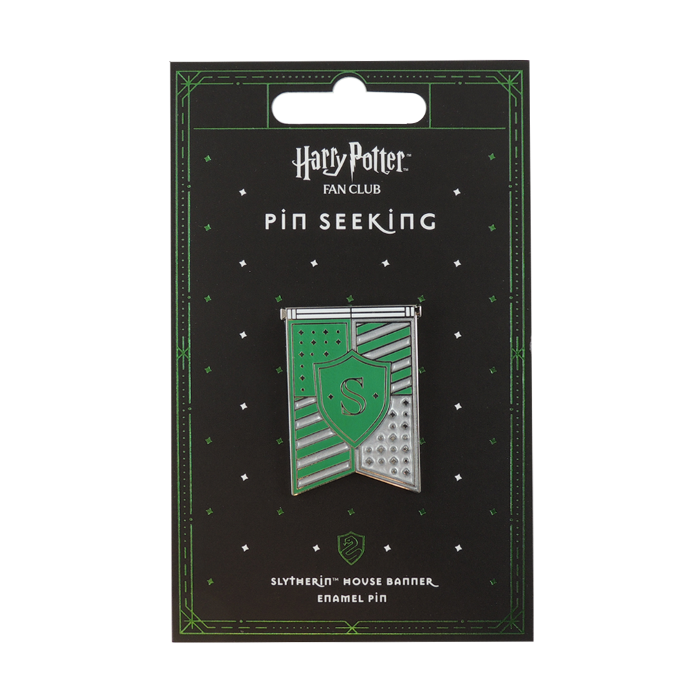 Add some Slytherin flair to your Harry Potter Fan Club Pin Seeking collection with this house banner pin! This pin features the Slytherin house banner in green and silver. The pin is finely detailed, making it the perfect gift for all fans of Slytherin.