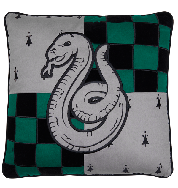 Show off your house pride with this bespoke Slytherin house cushion, perfect for any Harry Potter fan to add to their homeware collection. The unique design features velvet applique patches in emerald green and grey, the traditional colours of the Slytherin house.