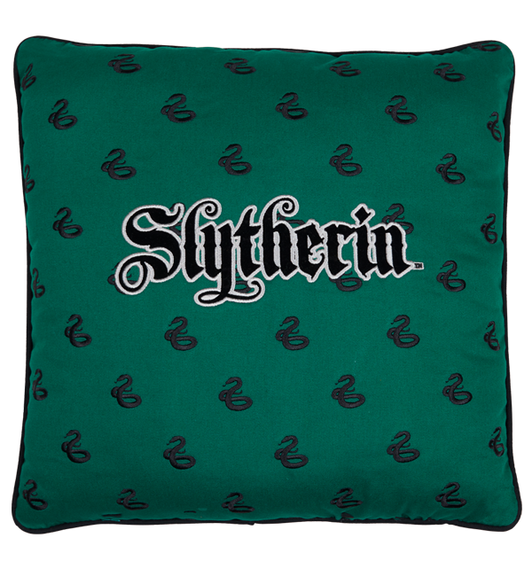 A large serpent, the iconic symbol of Slytherin, has been designed in the centre of the cushion with a grey and black colouring. The reverse features embroidered detailing and the Slytherin house name. The pillow contains a non-removable cushion pad.