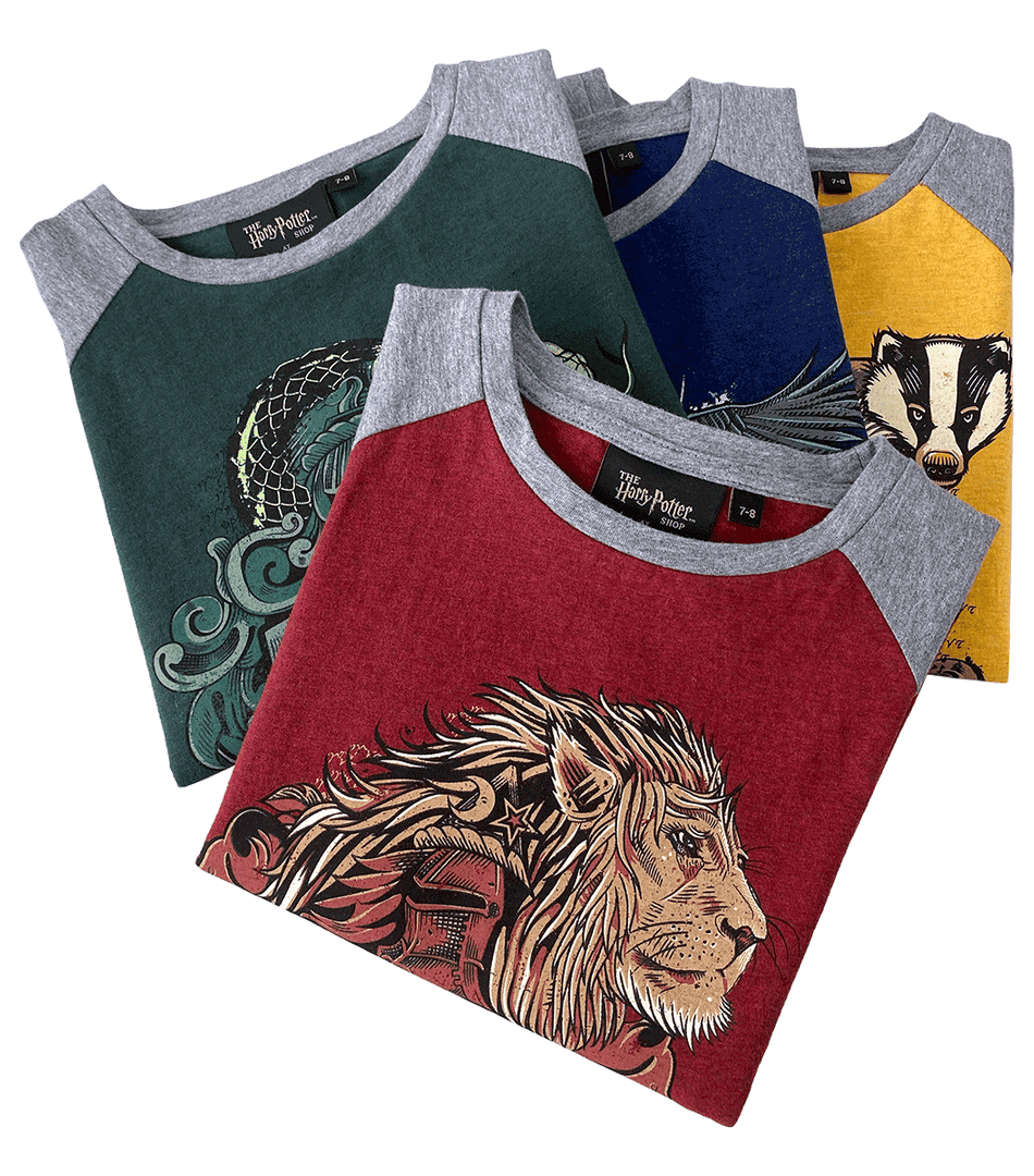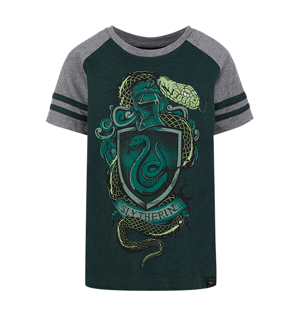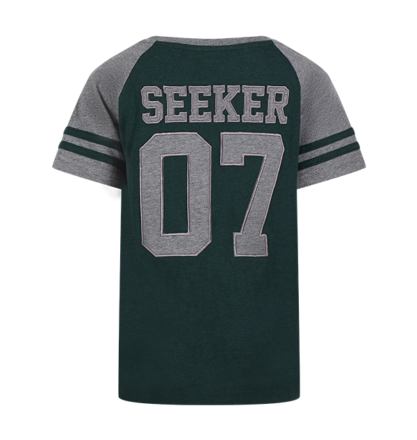 This brand new Kids Slytherin T-Shirt features the Slytherin crest in traditional emerald green house colours. The cosy t-shirt is made from 100% cotton and is complete with two green stripes on each sleeve and a unique snake design, the historic symbol of the Slytherin house. The word Seeker features on the reverse with its Quidditch position number in a light grey font.
