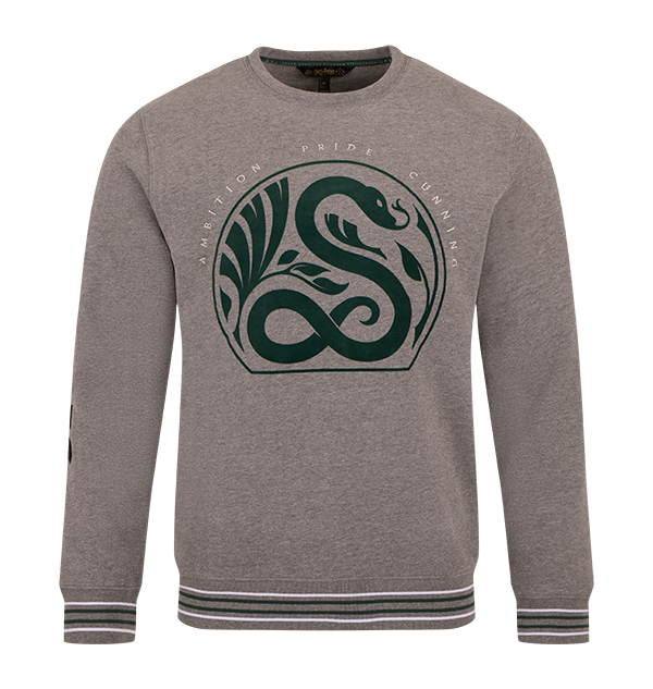Add some magic to your wardrobe with this unisex Slytherin sweatshirt. The light grey sweatshirt features an emerald green design of a serpent, the Slytherin house animal. The key traits of Slytherin students’ ‘Ambition’, ‘Pride’ and ‘Cunning’ features in the centre of the sweatshirt in white.