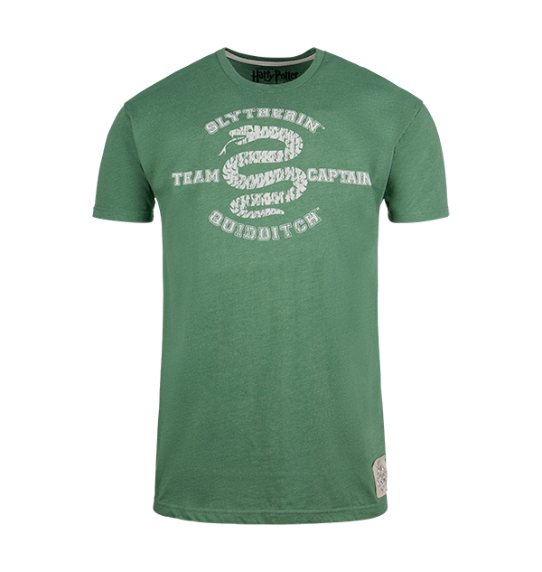 Join the Slytherinย Quidditch team with this Slytherinย Quidditch Team Captain t-shirt. The t-shirt is a greenย colour, the traditional colour of the Slytherin house, and features a raised flock print design across the chest in greyย of the Slytherinย house crest, a snake.