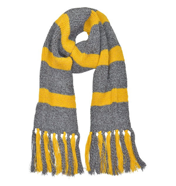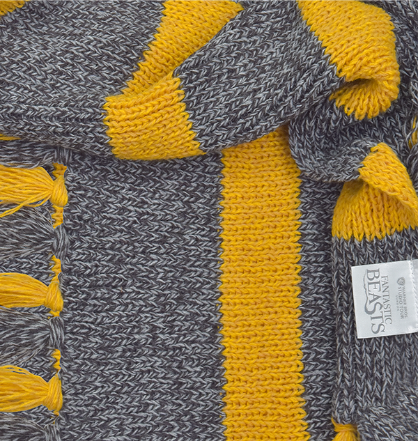 This scarf is a high-quality recreation crafted in the same Scottish mill where many knitwear items used in the Harry Potter film series were created. Made with a specially made wool-silk yarn, this wide striped knit of yellow and grey measures at approximately 160cm long (not including the tassels), and 22cm wide. A level of quality sure to be appreciated by fans and collectors alike!