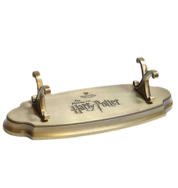 Keep your favourite wand on display and show off your school pride with this unique wand stand, the perfect way to exhibit your collectable wand. This metal Harry Potter wand stand is embossed with the logo of the Warner Bros. Studio Tour London in the centre of the stand and is a great way to present your bespoke Harry Potter wand anywhere around your home. The stand has been designed with a gold finish and measures approximately 22x8x6cm. Please note collectable wands are sold separately.